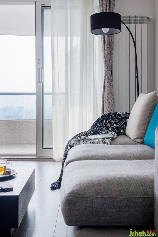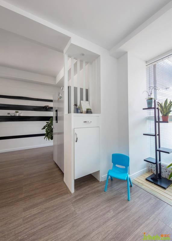 右边半高小鞋柜存放常穿的鞋,鞋柜上方镂空隔断让空间更加更加通透同时也能隔档冰箱。