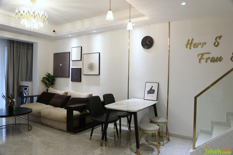 大理石+金边的电视机墙,是客厅极其养眼的存在,从细节处彰显精致的家居品味,沙发和电视柜是业主结婚时购买,融入到现在的设计里面,再配上同色系的装饰画,色调统一又相互呼应