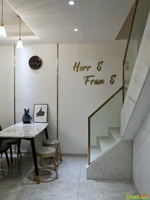 作为一楼到二楼的过渡地段,设计师用金色的扶手来装饰,加入大型的植物墙纸,形成了一条美轮美奂的金色道路