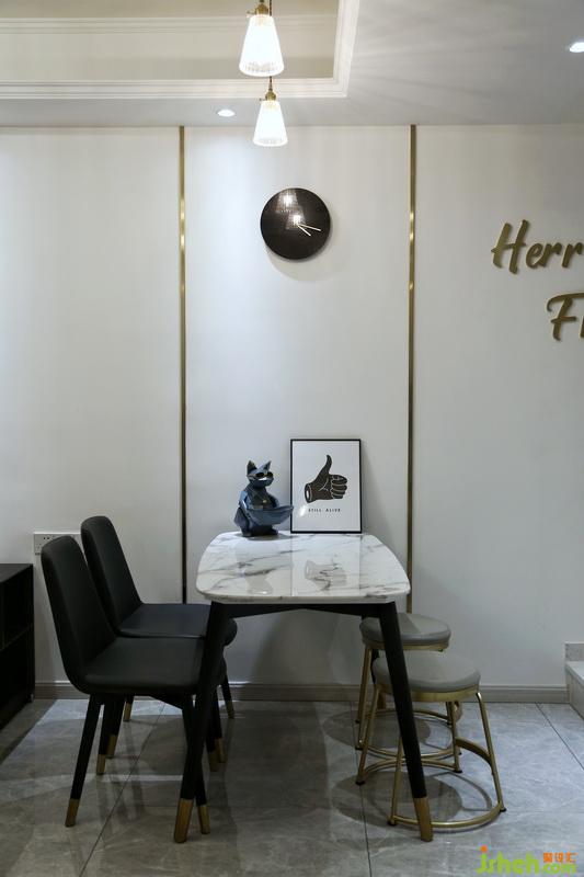 金属线条流畅写意,铺贴于墙面,极具高级感,流水纹理般的烟灰色瓷砖,从客厅贯穿到餐厅,气质范儿十足