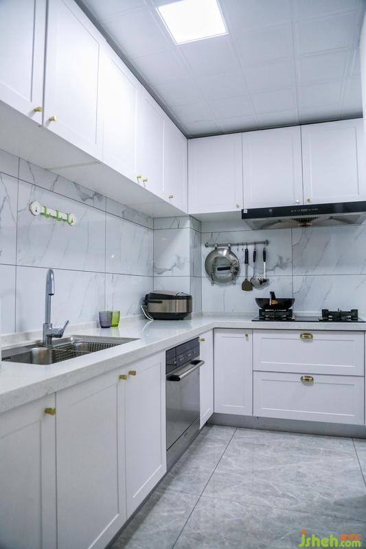 将明朗透亮的白色融入厨房,改善了厨房采光弱的缺点,黄铜材质的把手点缀其间,散发出闪闪发光的温暖色调,带石纹的瓷砖上墙,轻松将厨房的格调再提升几个档次,橱柜内部合理的功能规划,也让日常使用更为便捷