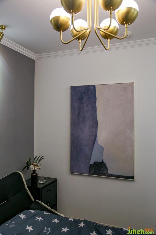 业主喜欢简单的颜色,所以墙面以及装饰画,都选择了块状色彩进行搭配,家具也选用尽可能简洁的造型,配上一盏暖黄色的吊灯,让整个睡眠空间从容安静