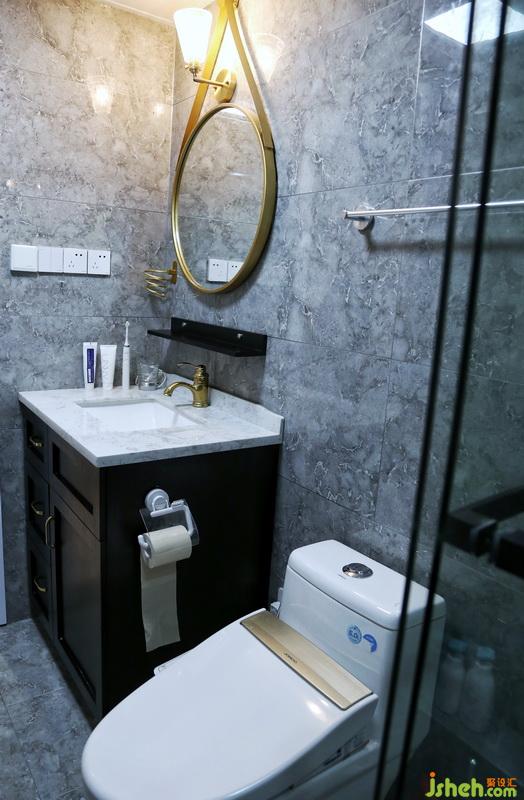 以简约为主的空间,搭配了一款干净利落的圆形镜,给卫生间增添了一些个性和特色,镜子上方安有顶灯,使用起来赏心悦目