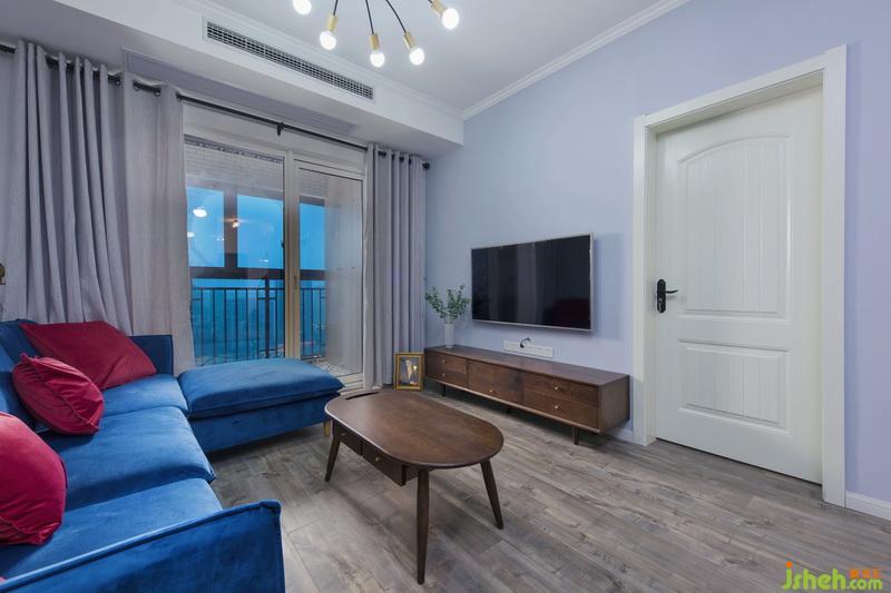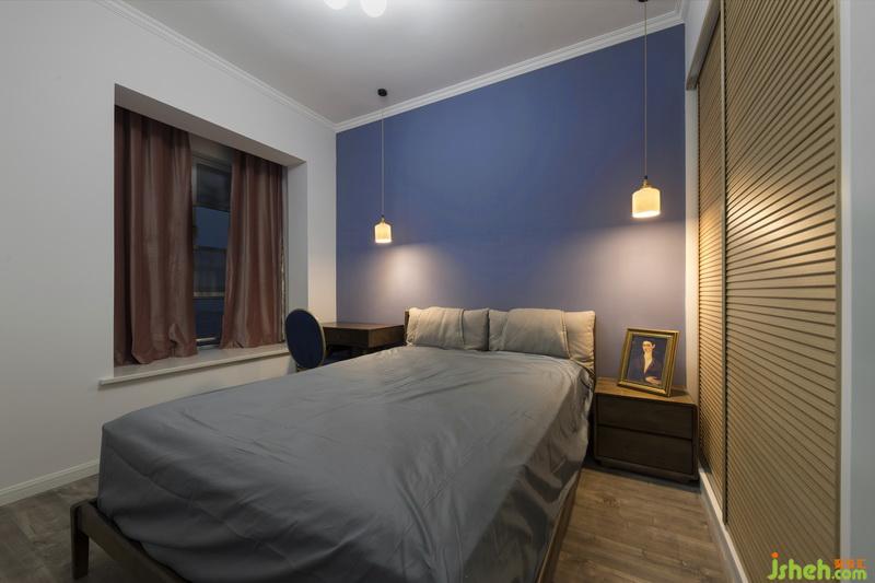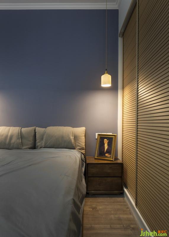考虑到卧室这类的休息空间,更适合安静、舒适的配色。所以床头背景选择了安静的深蓝色,与客厅在色彩上产生了关联。