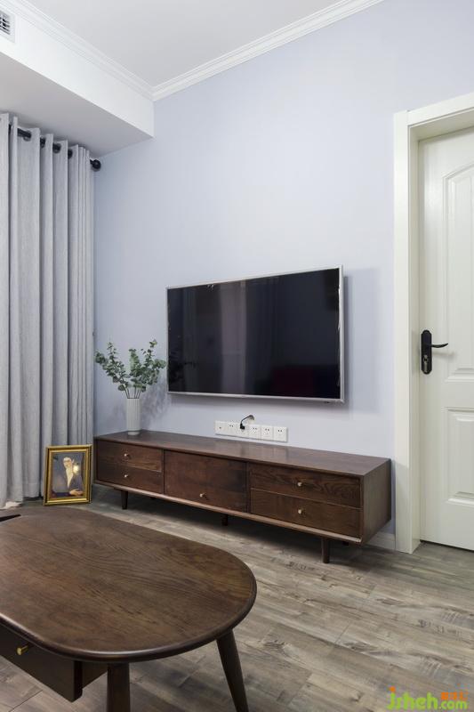 墙上的挂画,有着中式动画《大鱼海棠》般的古典与浪漫,极具巧思。亚麻材质的灰色窗帘和整体色彩极搭。每当夜幕挂在天边,灯光轻柔,坐在沙发前看电视,是小夫妻一天之中最享受的时光。