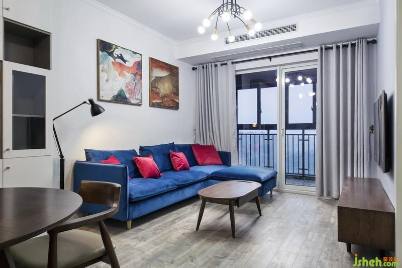 进入客厅后,蓝红交织的空间即刻映入眼中。孔雀蓝的丝绒沙发,是在方案最初就确定下来的“必入品”,配上红色丝绒抱枕,形成大胆的红蓝撞色。这是家给人的第一印象:时髦。