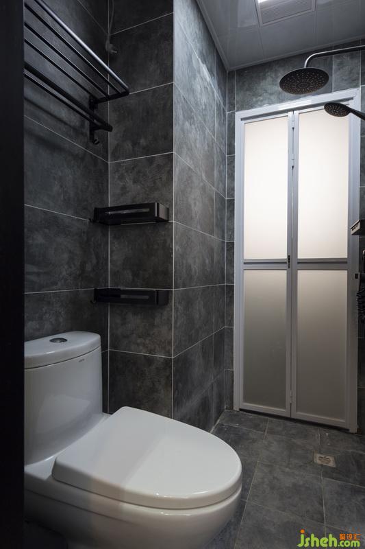 推开卫生间的门,是干净利落的烟灰色瓷砖,墙面和地面色彩统一,搭配黑色的毛巾架、悬空储物格,轻轻松松就打造出简约经典的洗浴空间。