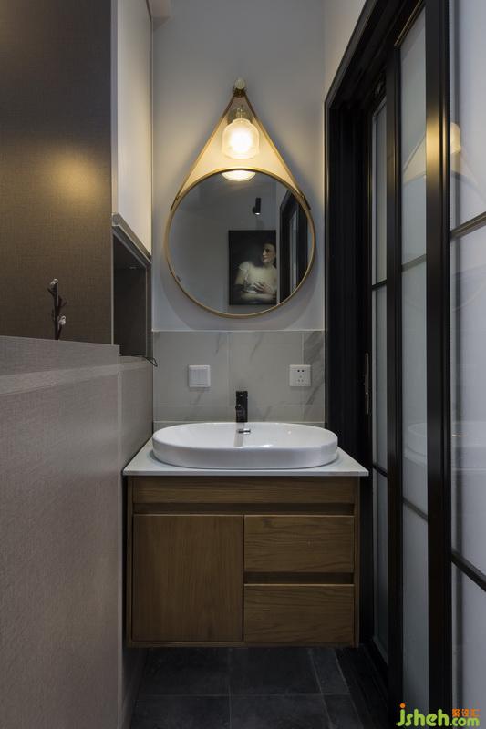 设计公司将洗手台设置在卫生间外面,做到了干湿分离。原木色的储物柜在色彩上与厨房相呼应,悬空的设计更易于清洁打扫。如月亮一般的圆形镜子,赋予空间趣味性。一幅油画恰到好处地映入镜中,有种复古迷离的梦境之美。