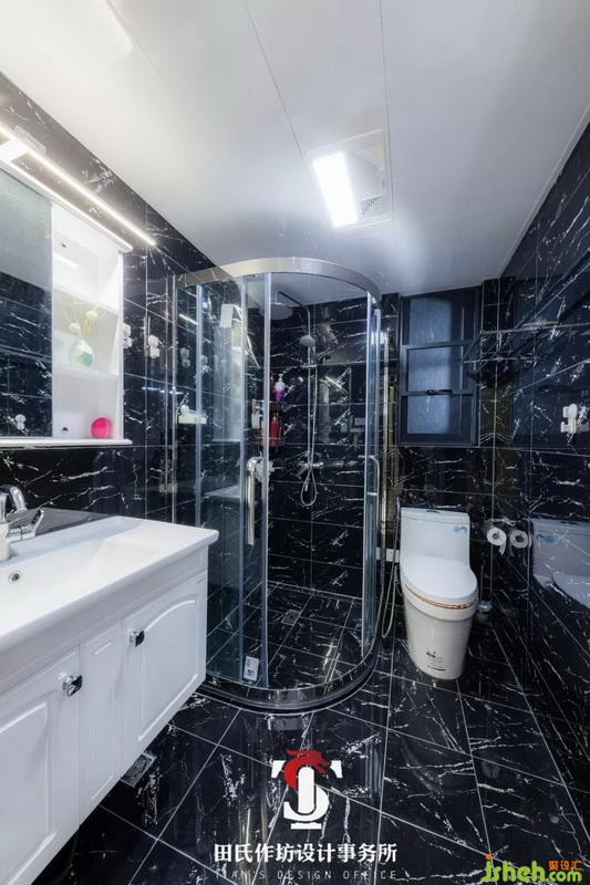 卫浴间的空间并不宽大,室内设计师对空间进行了合理运用,色彩上室内设计师采用经典的黑白配,砖的选择上使用了非常有质感的亮砖,时尚大气的同时也非常容易打扫。