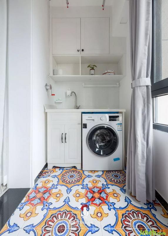 阳台处的地面也选择了花砖的形式,在大面积白色之中更加灵动跳跃。洗衣机加洗手池的设计保证的日常生活中,无论是小件衣物的手洗还是机洗都非常方便。