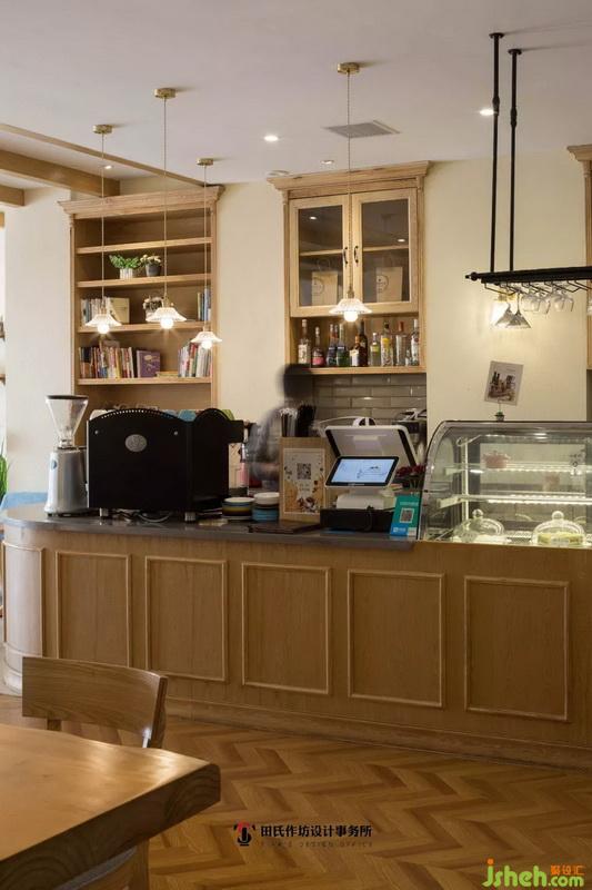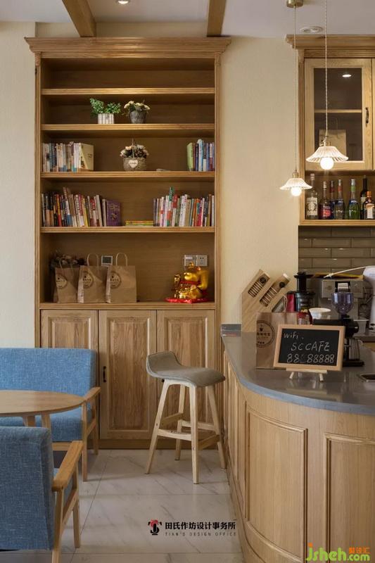 链条式的玻璃吊灯星星点点地装饰着吧台,室内设计师使用暖黄的灯光烘托出咖啡屋的浪漫氛围。桦木纹里的内嵌式壁柜、暖调射灯的称托、店主丰富的书籍积攒,这三元素的交织碰撞又增添了一抹欧美复古风情。