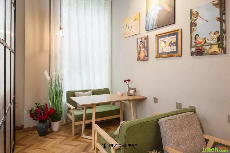 在这个分区,就软装而言,呈现出现代简约的风格,豆沙绿的布艺沙发、原木色的桌椅无不彰显着极简主义。墙面则采用了单一的灰色涂料,大小不一色彩对比强烈的几幅油画又为整面灰墙增添活力。
