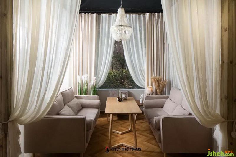 在这个分区中,最吸眼球的不过那面落地窗了,沙发的四周则以白色的半透明丝质纱帘作为隔断,头顶的巨型吊灯由磨砂玻璃片和少许的白贝母组成,在光源影响下,白贝母折射着微弱但又炫彩的光芒。