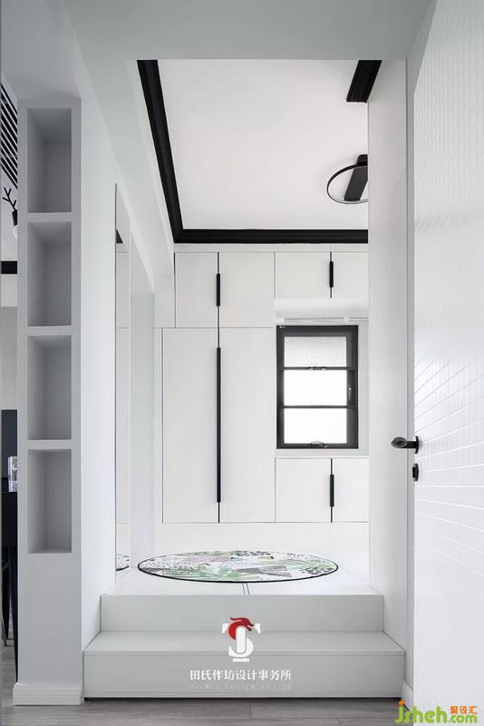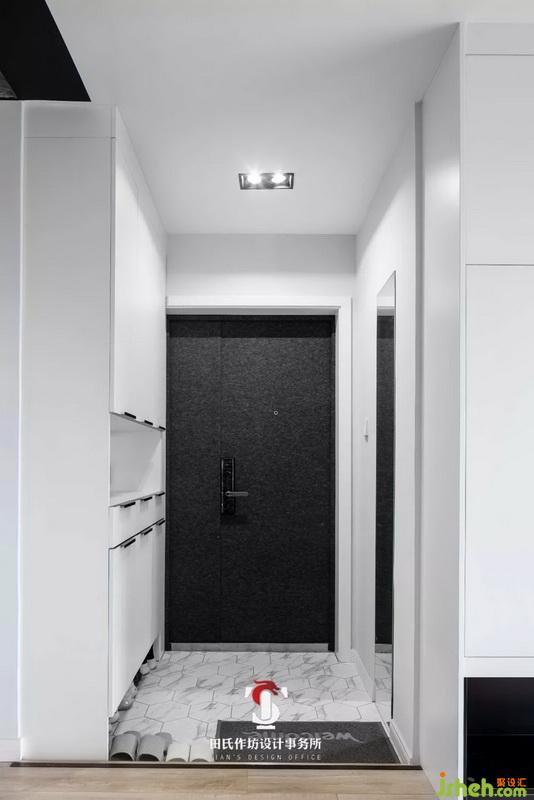 入户位置以下沉式的玄关做了分区,非常推荐这种上顶天,下不落地的玄关鞋柜,日常生活进家脱鞋临时放在最下面的空间,方便也整洁。简单的黑与白,光面与磨砂,质感十足。