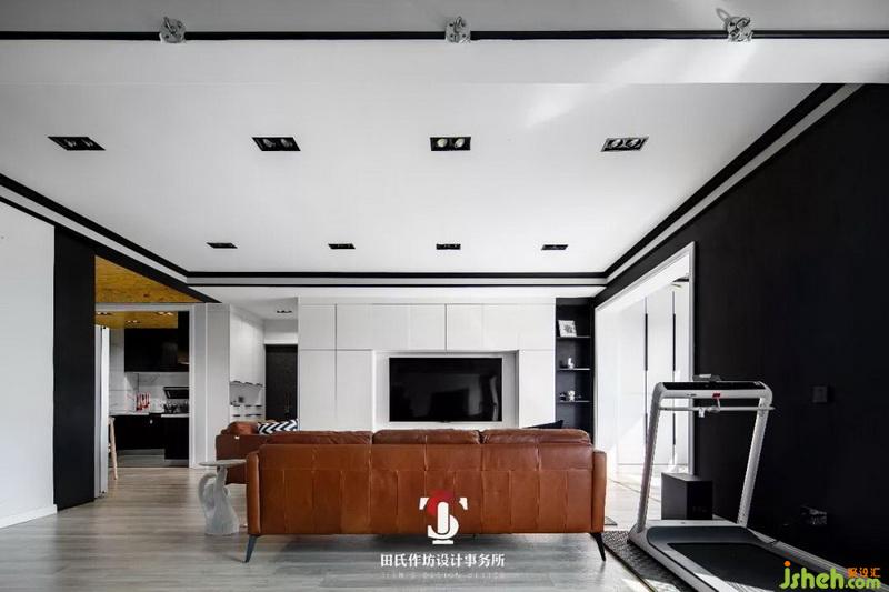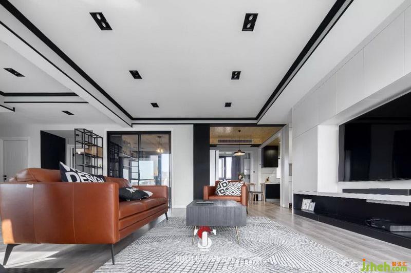 室内设计师在客厅的顶面采用了黑色线条的形式弱化了梁与吊顶之间的落差,整体以黑色线条加黑色色块的方式分隔区域,而皮质的沙发,黑色的钢架结构透露出工业风的气息。