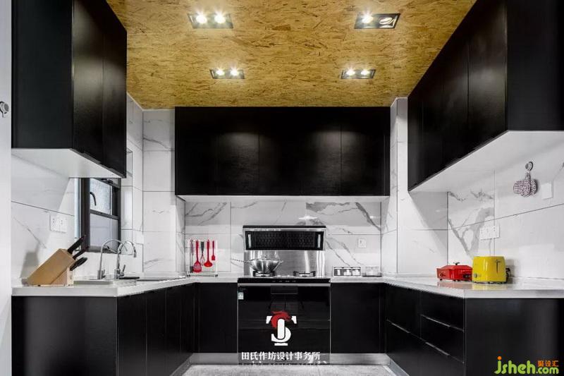室内设计师在厨房选择了开放式的,这样可以让整个餐厨空间看起来更加宽敞,U型的操作台面足够家中所有的电器摆放。由于客厅的选用了大面积的黑色色块,橱柜这里选择了清一色的黑,使得整体风格与客厅更加呼应,为避免色彩太过压抑,墙砖选择了有灰色花纹的白砖。