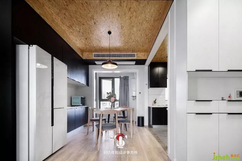 餐厅和厨房都采用了obs板吊顶,增强了整个空间的工业感,厨房也不再用传统的扣板灯,以斗胆灯的形式更加现代美观,餐厅的小阳台也纳入了餐厅的空间,每一寸空间都不浪费。双开门的大冰箱以内嵌形式更加美观,餐边柜也选用了和厨房一样的颜色,台面上足够摆放日常的物品。