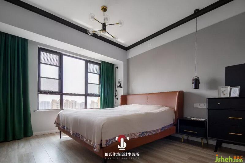 祖母绿色窗帘与光线倒影出的光影、灰色调的地板、皮质的床头靠背与深色的床头柜巧妙连接。主卧背景墙的雾气似的灰度中闪出一抹金色,似心脏的悸动,目光所及之处都是设计的个性。