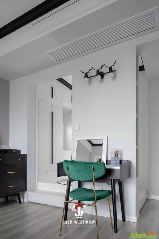 如果说书房是男人的标配,那么梳妆台一定是女人的最爱了,选用与窗帘色彩一直的椅子,搭配主卧随处可见的金色线条,鹿头灯照耀的爱美的小心思。
