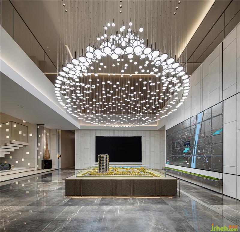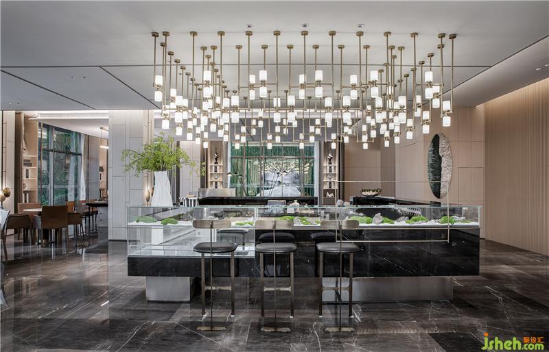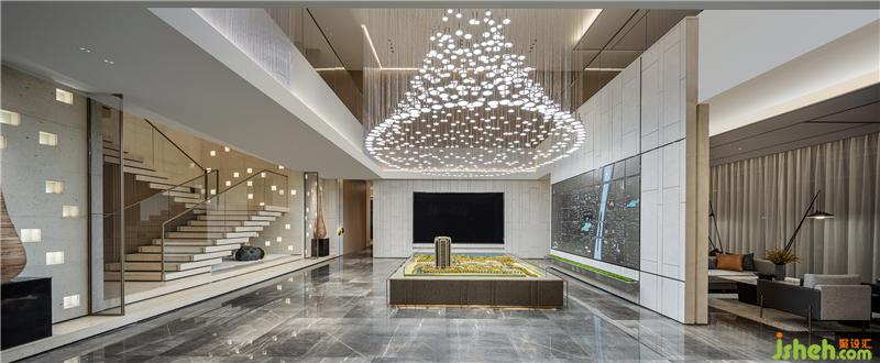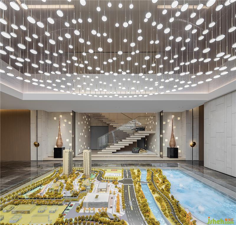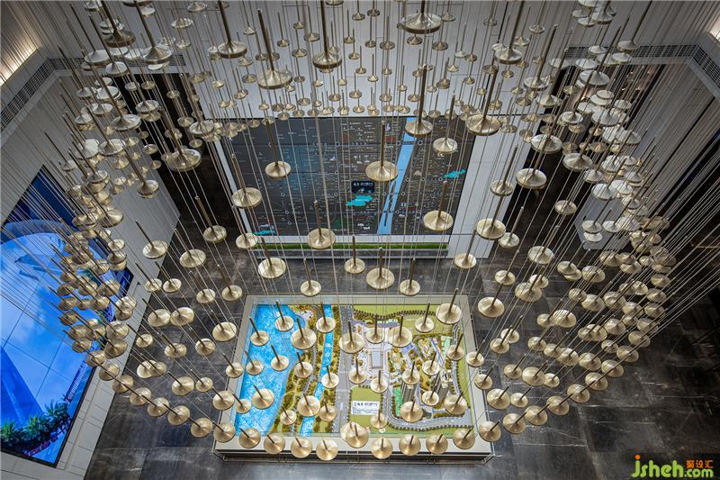 沙盘区至上而落的艺术灯具,以“水滴”涟漪在水中变幻形态为设计发想,轻盈飘逸。整体视觉空间形成聚焦,令观者留下深刻记忆点。