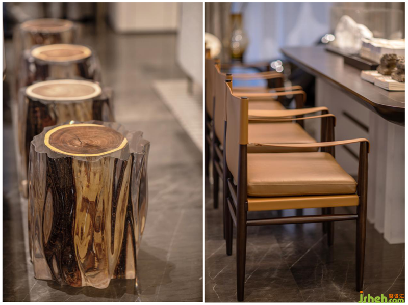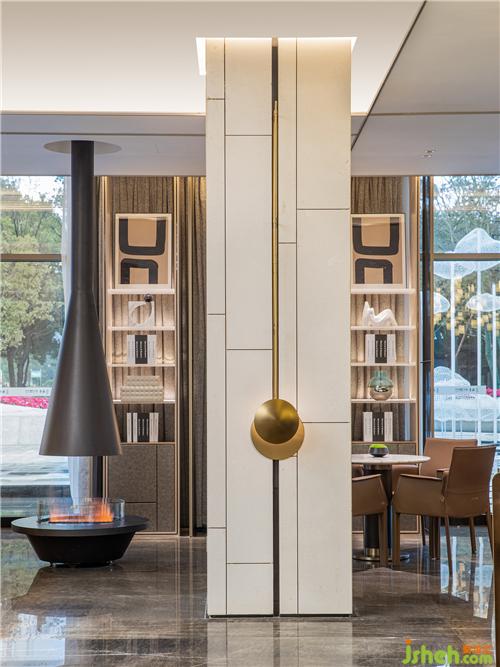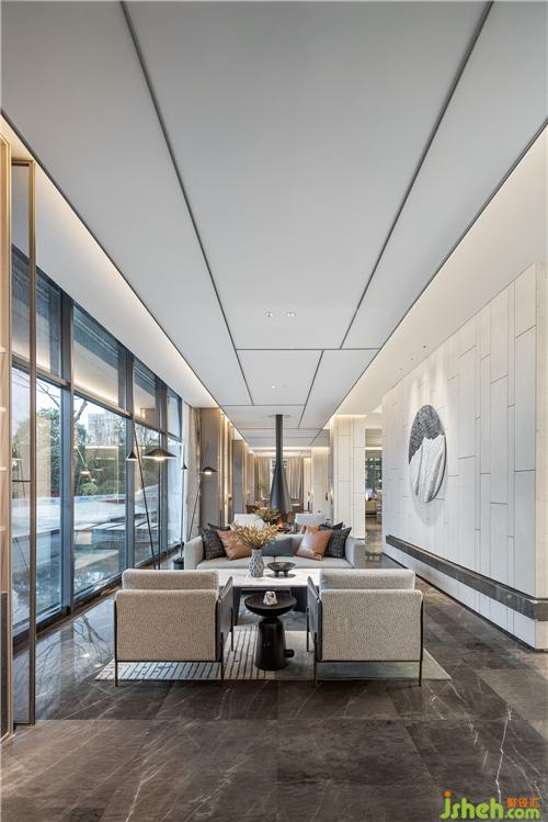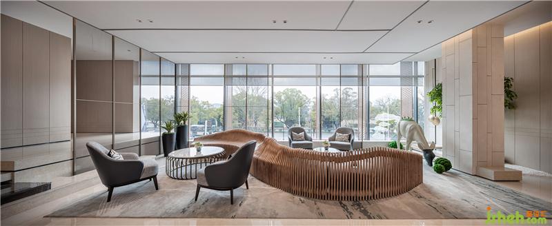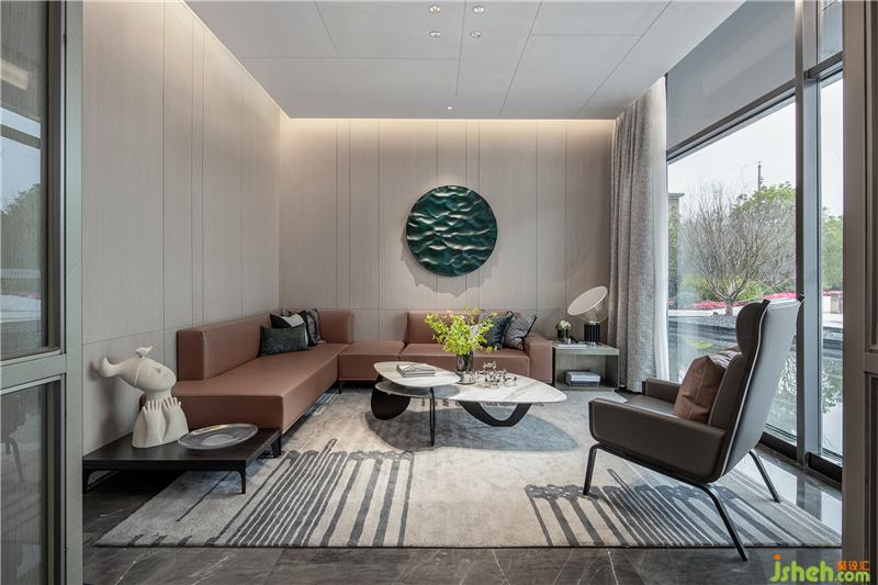 整个空间中最好的景致,莫过于紧邻玻璃幕墙的洽谈区域,外景引入室内,更烘托花墩坐月的意境。圆形画面展示满月状态,饰品营造彰显坐态轻松。