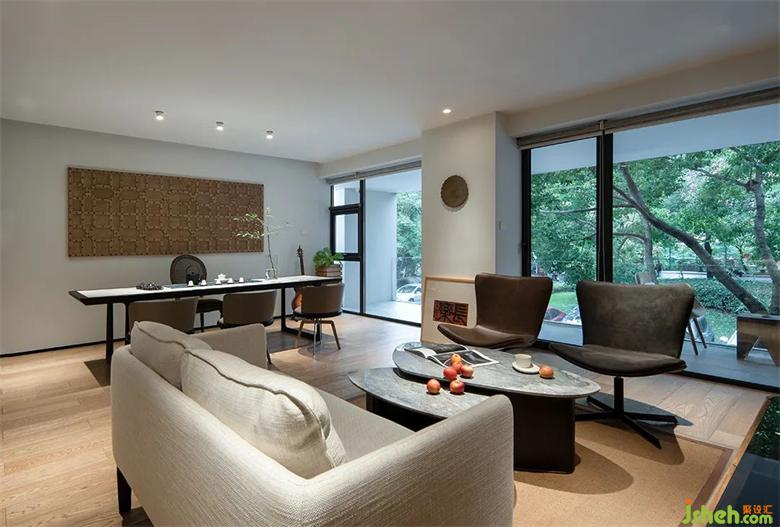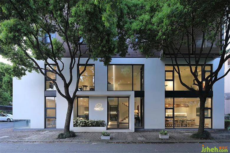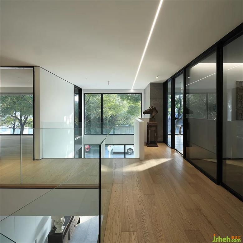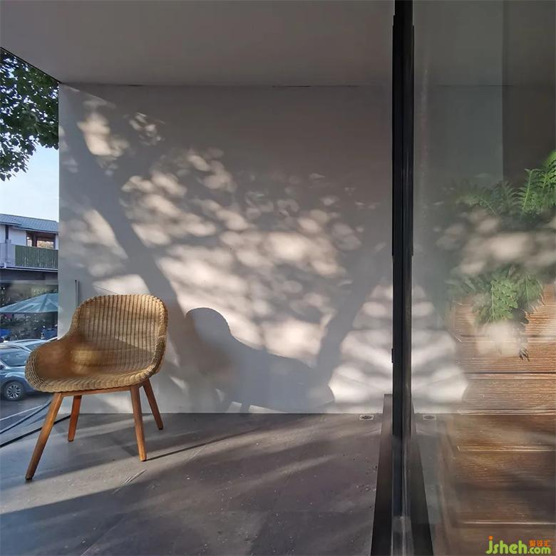 整个空间让视觉通透性最大化,阳光肆意投入,墙和玻璃倒映着斑驳的树影,也成了一幅幅画布,无论人立于何处,都能更多亲近自然和阳光,内心会充盈平静。
