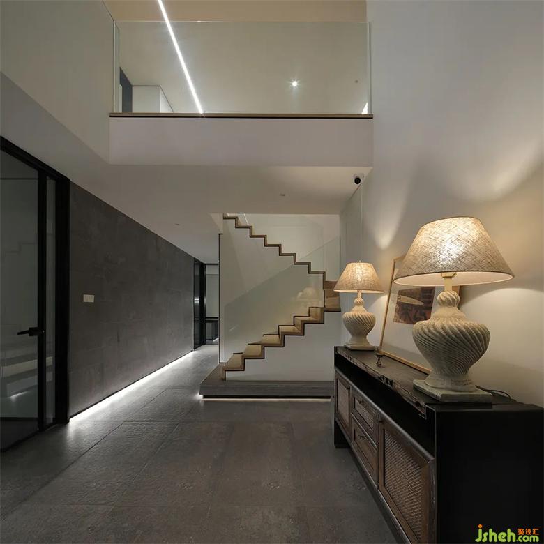 整个外墙主体线条和植被有着细致的有序切割及合理的线条规划,这样的有序一直延伸入内,木质楼梯以几何折线造型呈现,简洁而富有细节,大面积通透的玻璃扶手、冷灰色砖面的肌理,事务所设计纯白色的墙体和木质的自然温度和谐的结合,形成一种反差的呼应。