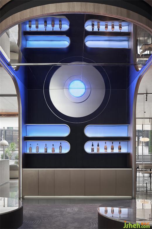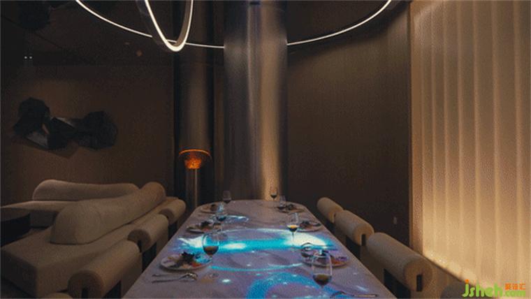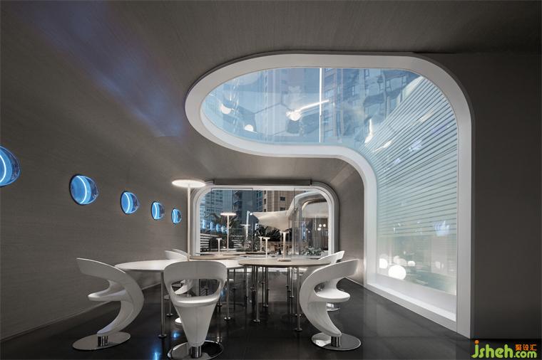 侧面玻璃墙呈现出“天圆地方”的传统宇宙观,黑色石材地面,通过光的反射和投影,营造出如同大地的深邃效果。会所设计打破传统的家具形式,设计师以行星散布的形式设计了多功能厅的桌面。可移动的桌椅如同行星的运行,让空间的功能通过家具的变化而多变,可会议、可娱乐,为消费者带来与众不同的感受和体验。