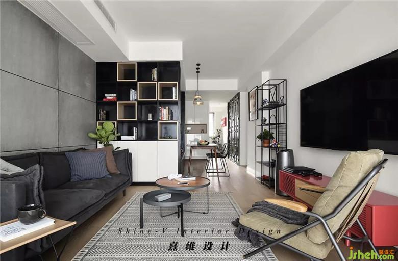 从阳台看向客餐厅区域,展示收纳柜和金属展示架也是空间中的重要家具成分,是空间的重色部分,能够压制住整个场域,达到空间状态上的平衡。同时开敞式的空间拥有更多的自由与流通,更加符合年轻人的需求。