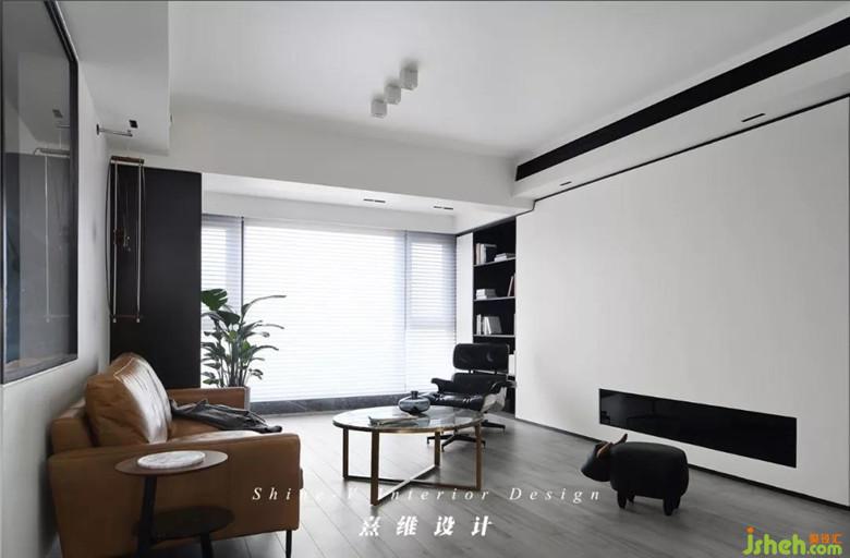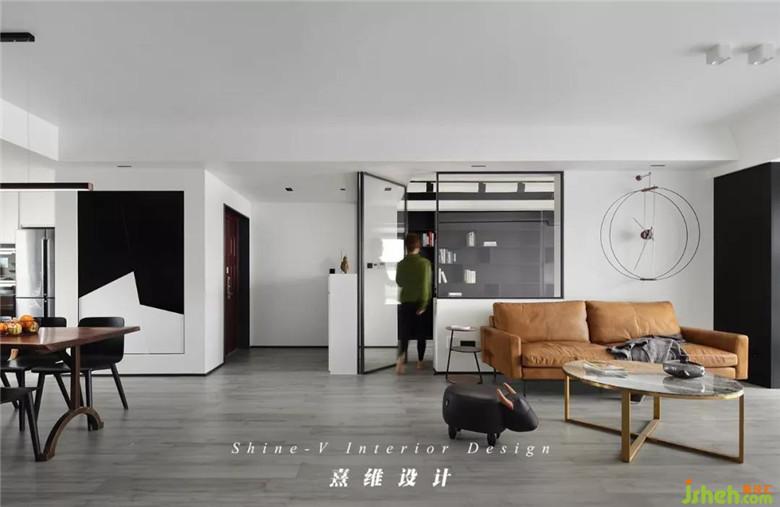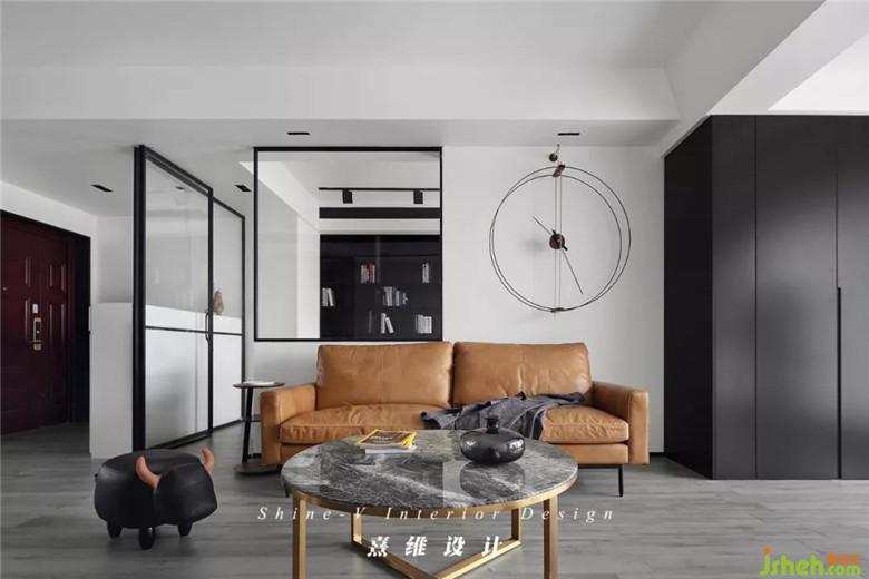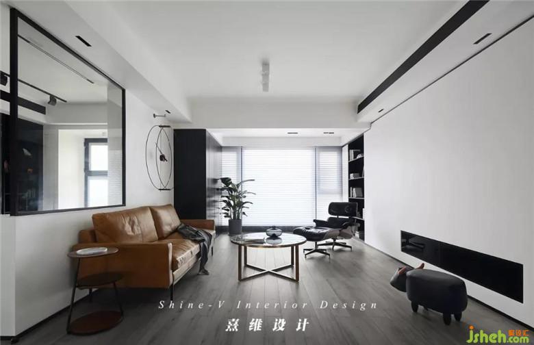 ▲以黑白灰色为空间基调——入户便能感受到整个空间浓郁的简约现代风,其中沙发作为客厅中的主体家具,以暖色调棕色进行点缀、中和。沙发后便是书房,室内设计师通过玻璃隔断的处理方法保证了室内的采光,光线的晕染下,家具更有质感,织品更加舒适,黑色与棕色也避免了沉闷。