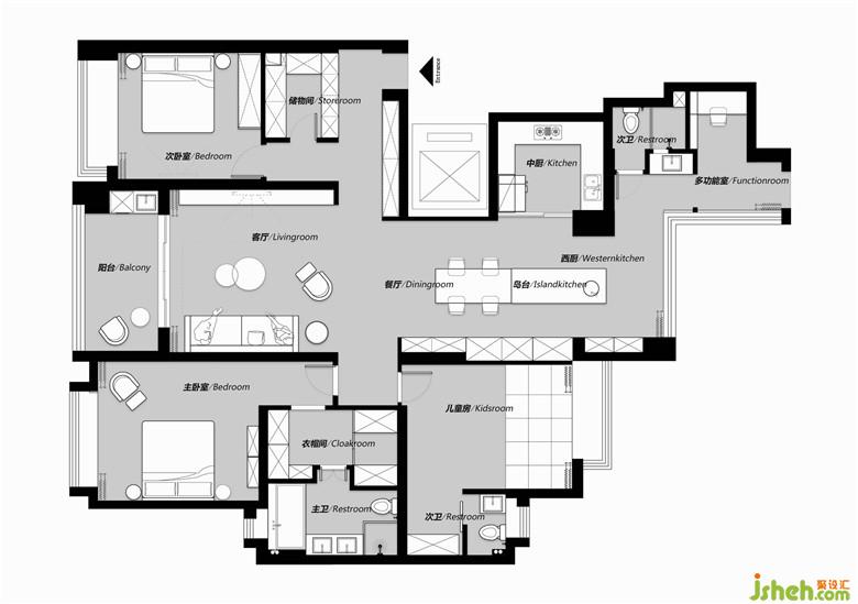 儿童房的设计尽可能多的给予孩子活动空间,并增加了一个小的卫生间,对于大户型来说更加方便孩子使用。配色上使用深蓝色,黑色和湖蓝色增加视觉效果,体现儿童房的活泼性。
