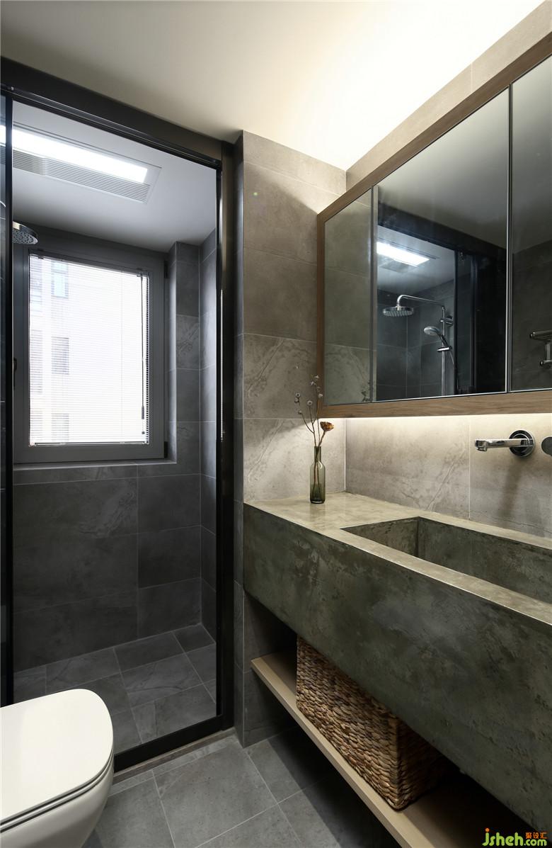 ▲干区区域,墙面贴米灰色砂岩砖+木质搁板,现场砌的水泥台盆复古又时髦,依旧可以营造出空间的利落清爽。