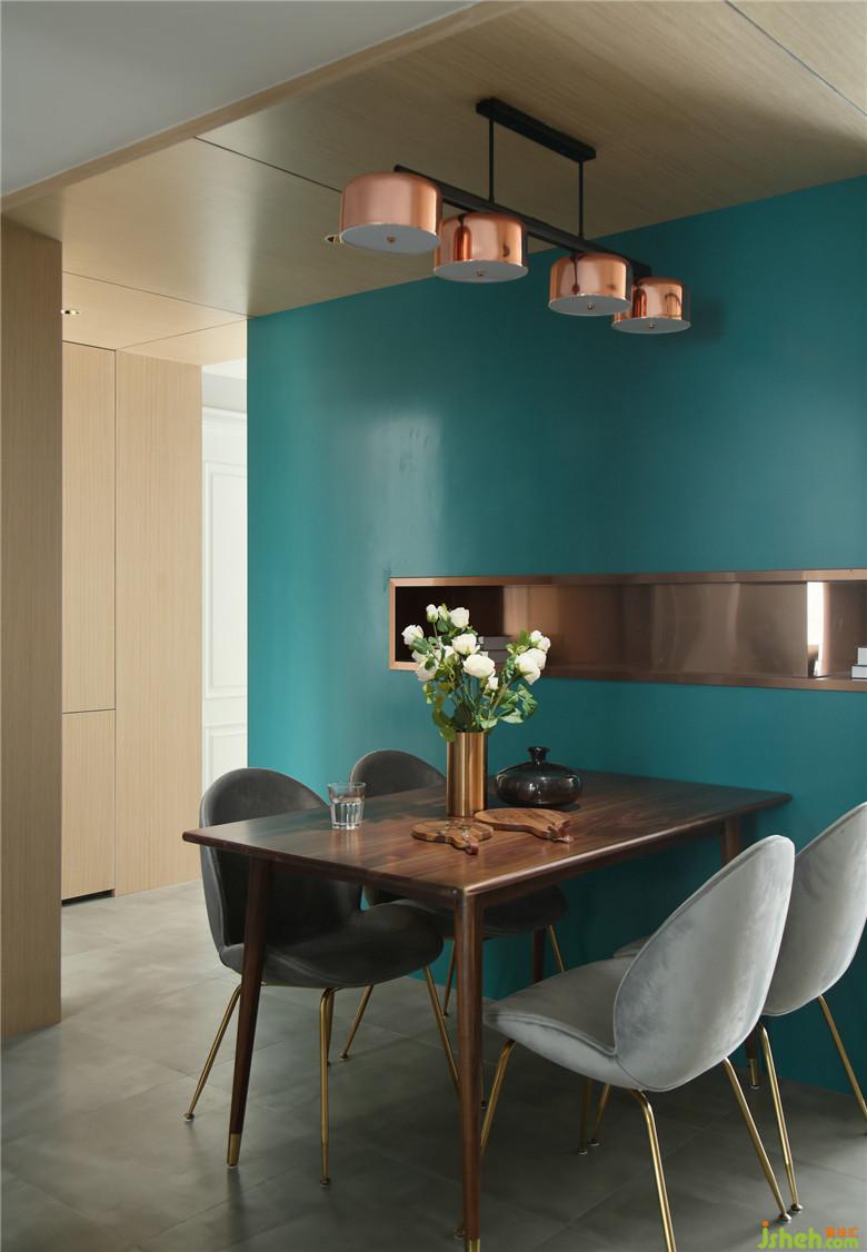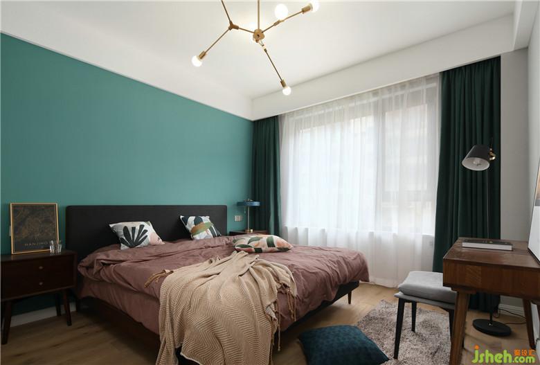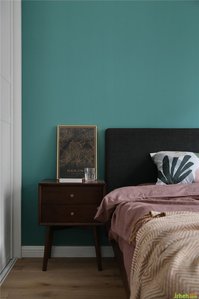 ▲主卧墙面也依然延续着餐厅蓝绿色调,精心挑选的装饰画,柔软的织品与木质家具,色彩与材质互相搭配,赋予生活舒适感。