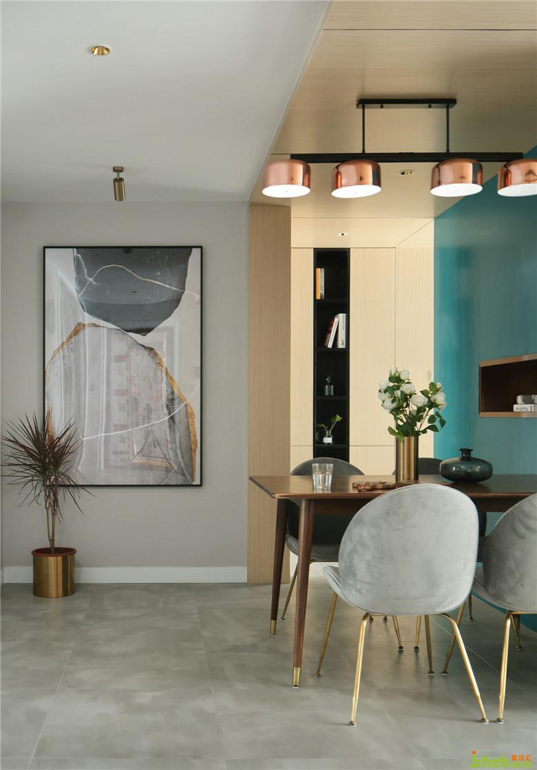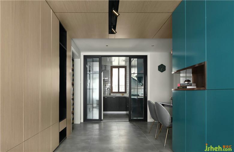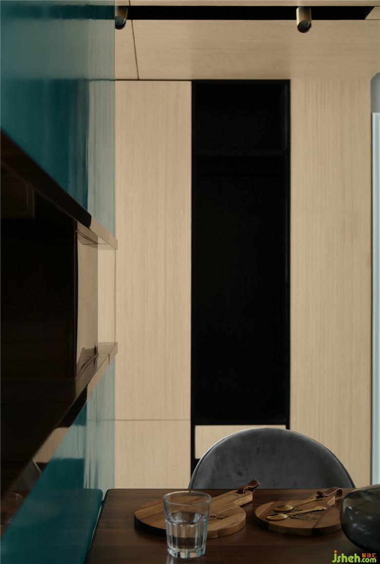 ▲在进门一眼望过去的尽头配以精心挑选的装饰画,辅以射灯,在入户处便能感受到整个空间的设计理念,轻松悠然,却也精致灵动。右侧的鞋帽柜其中室内设计师增设了抽屉式换鞋凳,让屋主回家或出门时不必弯腰,很是贴心的小细节设计。而木质元素从空间立面一直延伸到顶部,使这片场域形成整体功能区。
