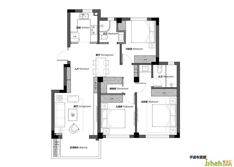▲室内设计师将原户型厨房不必要的隔墙进行拆除,以定制的黑框玻璃移门增加空间的采光及通透感。厨房空间用色层次分明,以最为经典的黑、白、灰三色营造出空间的利落清爽。