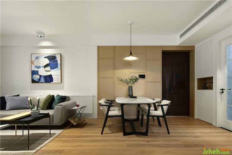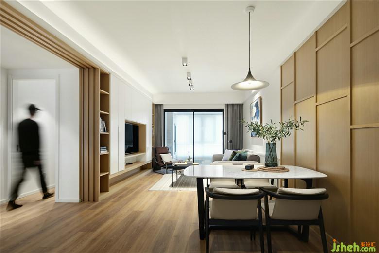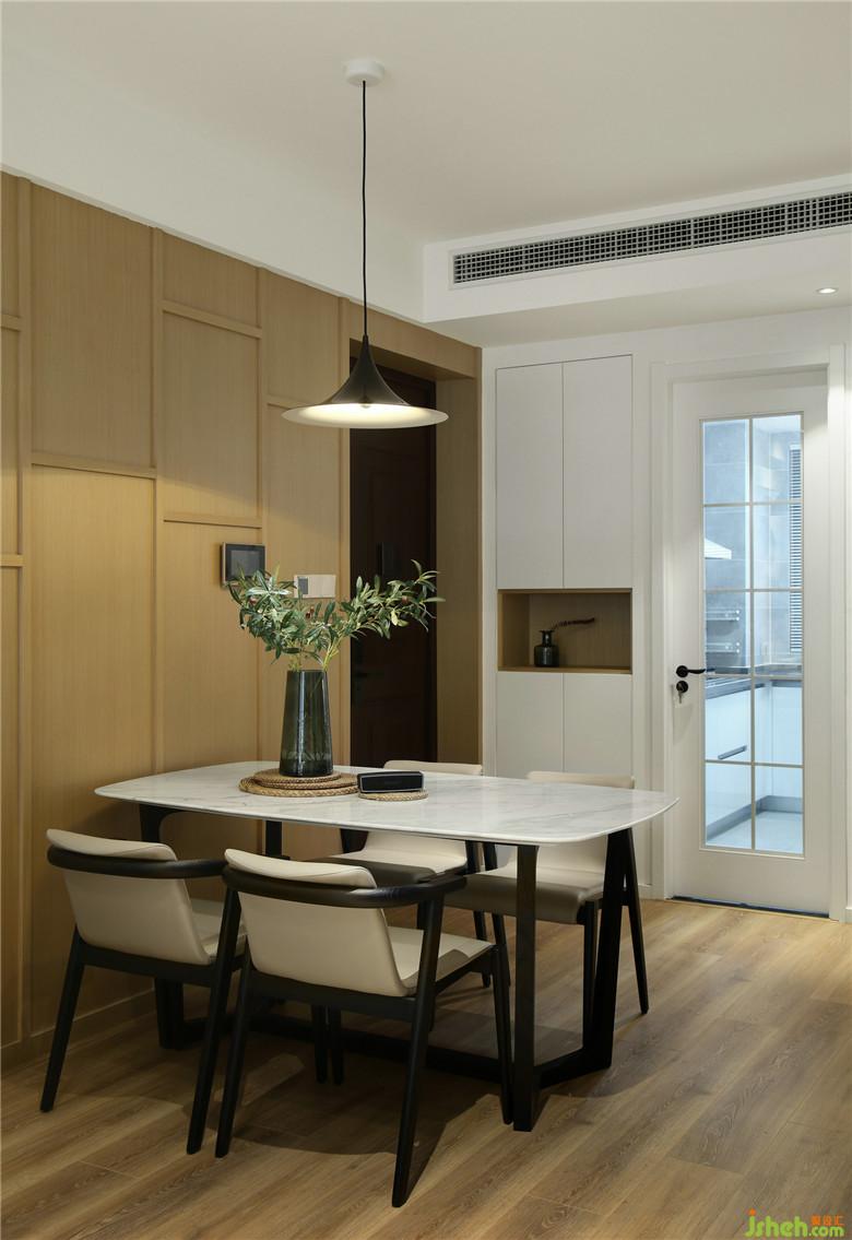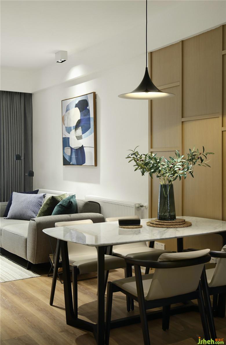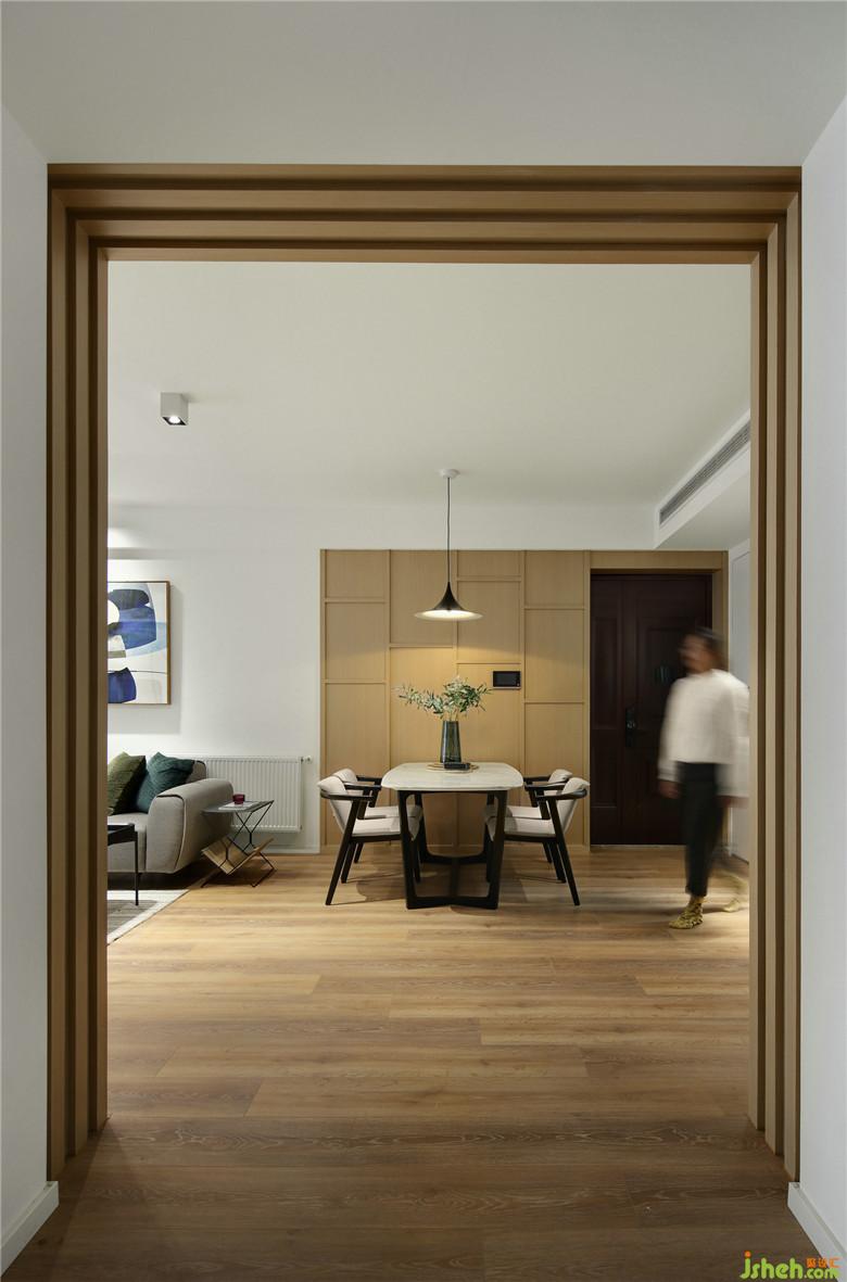 ▲餐厅区域以定制的木质造型墙作为这片区域的装饰和起到划分功能区的作用,木元素的运用贯穿室内。室内设计师精心挑选的装饰画,木质温润的餐椅,质感优雅的大理石餐桌,每件单品的选择都是想为家增加一抹艺术气息。