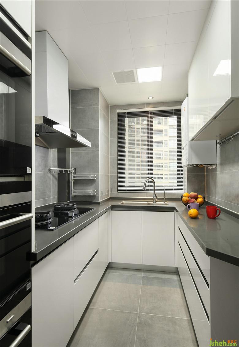 ▲厨房空间用色层次分明,以最为经典的黑、白、灰三色营造出空间的利落清爽。为了避免橱柜边角的磕碰,室内设计师做了缓冲的转角设计,让行走动线更流畅。