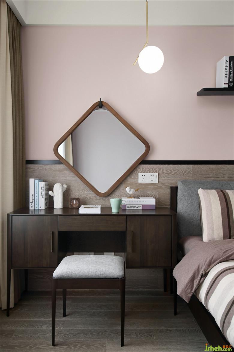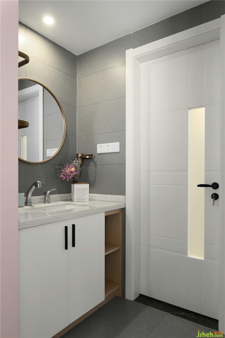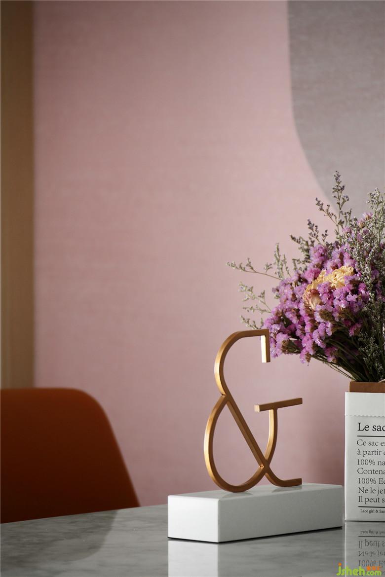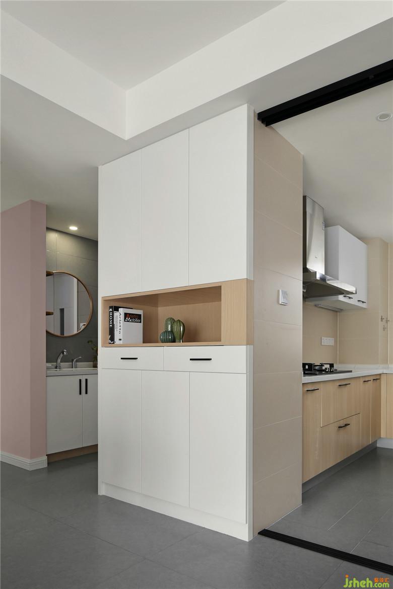 ▲过道储物柜的设计不仅起到功能区过渡转折的作用,也为住宅提高收纳功能。干区的墙面与地面材质、颜色统一,而柜门与房门也是统一颜色,粉色作为基调也一直延续着,室内设计师很巧妙的在沉稳与俏皮中寻求平衡,匠心独运。