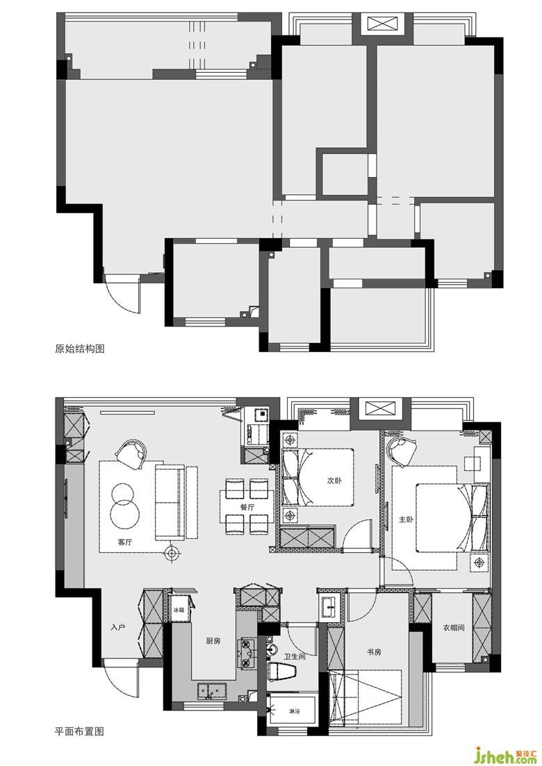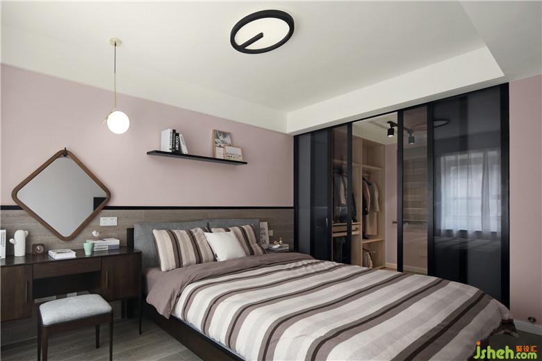 ▲为了使主卧与衣帽间更为紧密联系并且方便出入,室内设计师将原户型中的隔墙打通——设计为现在的黑框玻璃移门,同时改变原先的进门位置。而主卧墙面也依然延续着空间基调,旨在达到屋主对艺术追求的同时,保证住宅应有的舒适度与温馨感。