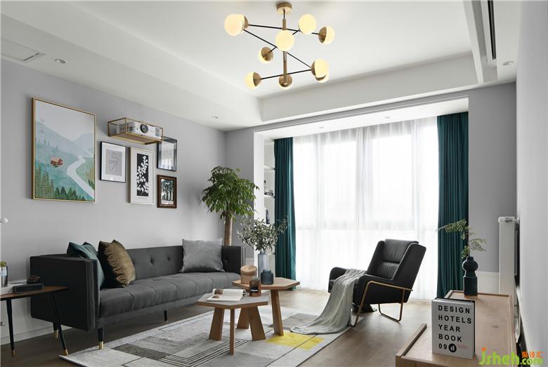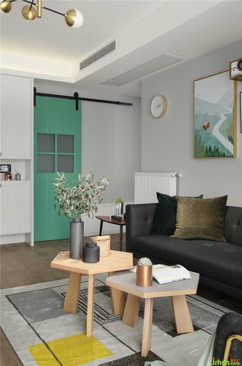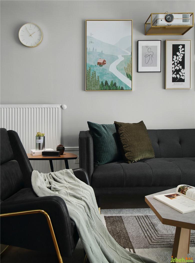 ▲将原户型阳台并入客厅扩大区域,也增加了客厅的采光使之更通透温暖。室内墙体以浅灰色为底,室内设计师以深色家具作为重色压住整个空间,将屋主喜爱的绿色贯穿到室内装饰上,装饰画、抱枕亦或是窗帘,都与全屋和谐的搭配着。
