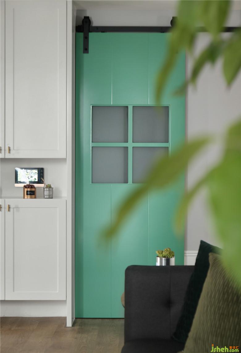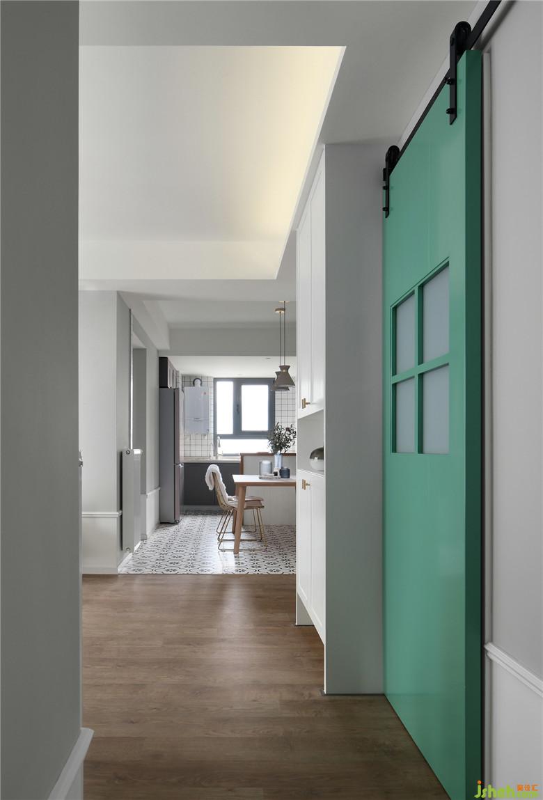 ▲入户左手边是定制的鞋柜,白色的柜体与旁边的绿色谷仓门相得益彰。室内设计师将公共空间以低矮的白色护墙板围绕,增加室内的美观性的同时让墙面形成层次感。客厅设置投影仪,六边形的木质组合茶几,几何形地毯与舒适的布艺沙发,一家人可以悠闲地享受家庭影音时光,客厅是能够放松下来休憩的空间。