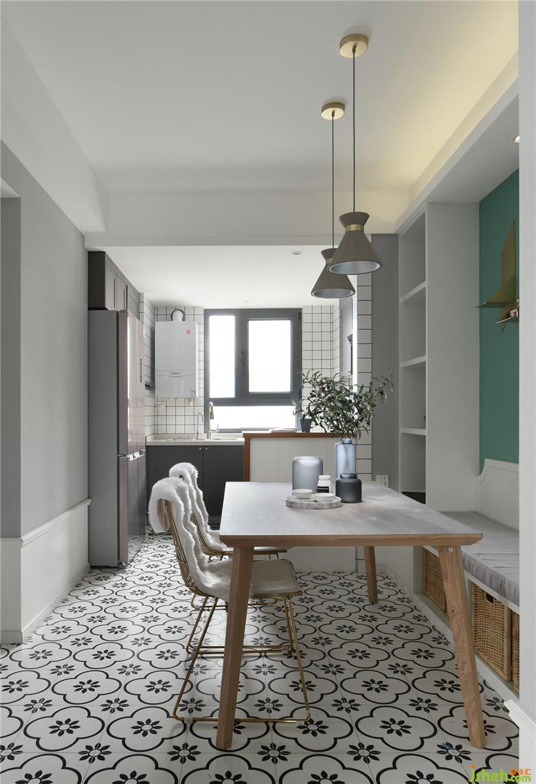 ▲餐厅背景墙室内设计师依旧选用了屋主中意的绿元素,在白色定制卡座的映衬下,让这片区域显得更加清爽,带给视觉极大地舒缓。开放式的布局让餐厅和厨房更加通透明亮,各个功能区的联系也显得更加紧密。