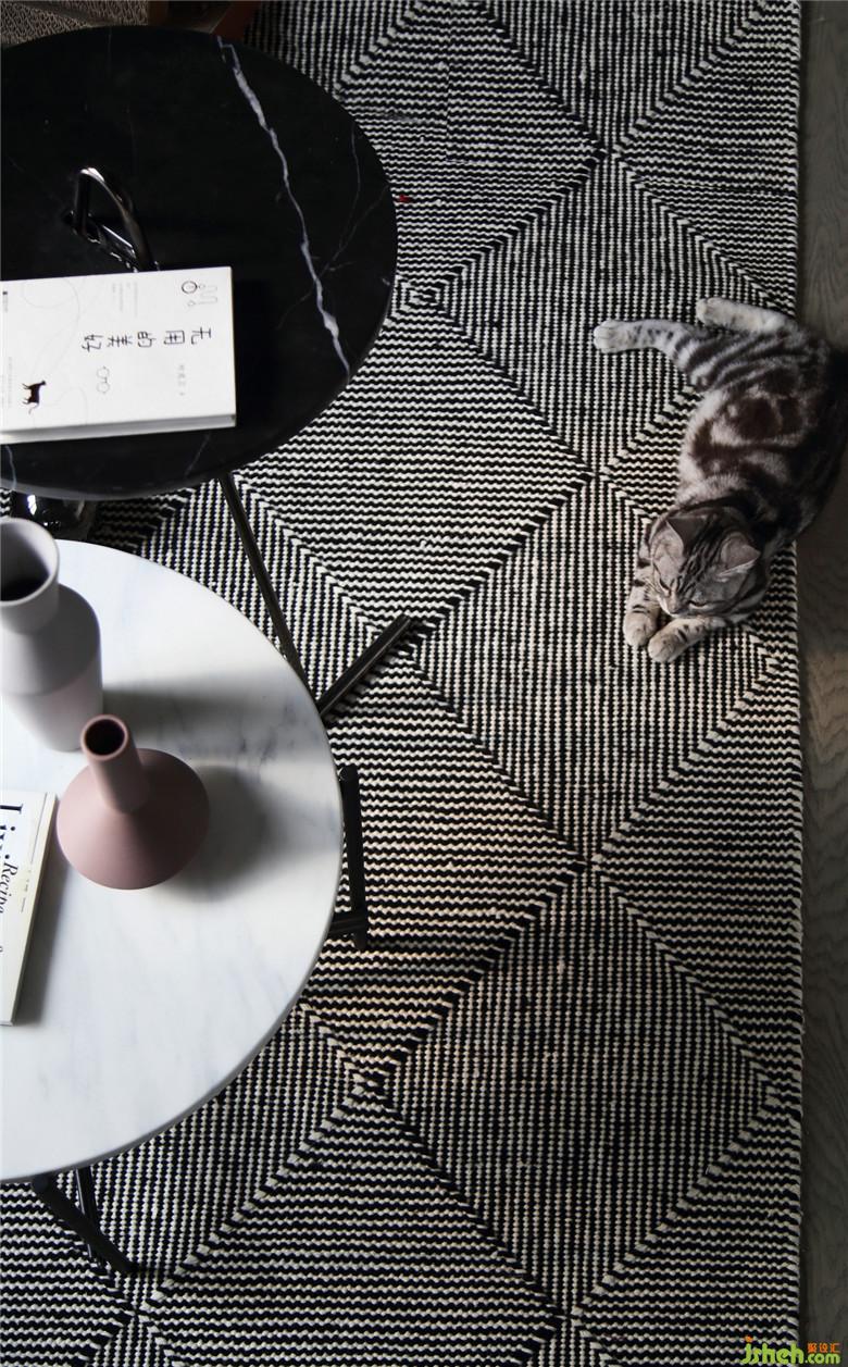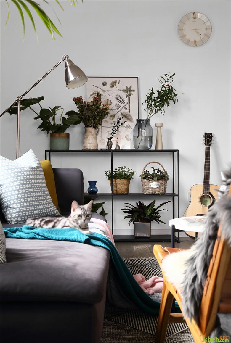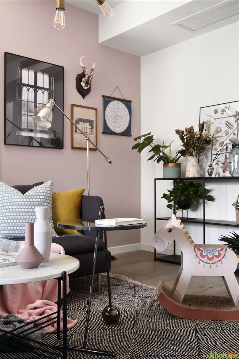 ▲在这个面积并不开阔的空间里,室内设计师将不同的元素进行着比对,而黑色金属线条的置物架,不仅满足了展示收纳功能,也不显得空间拥挤,恰到好处的交织出奇妙的平衡感。屋主夫妇的内心一定是柔软而充满童趣的,粉色木马仿佛回到了童年,弹着木吉他,有一只他和她的猫。