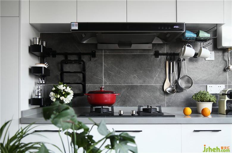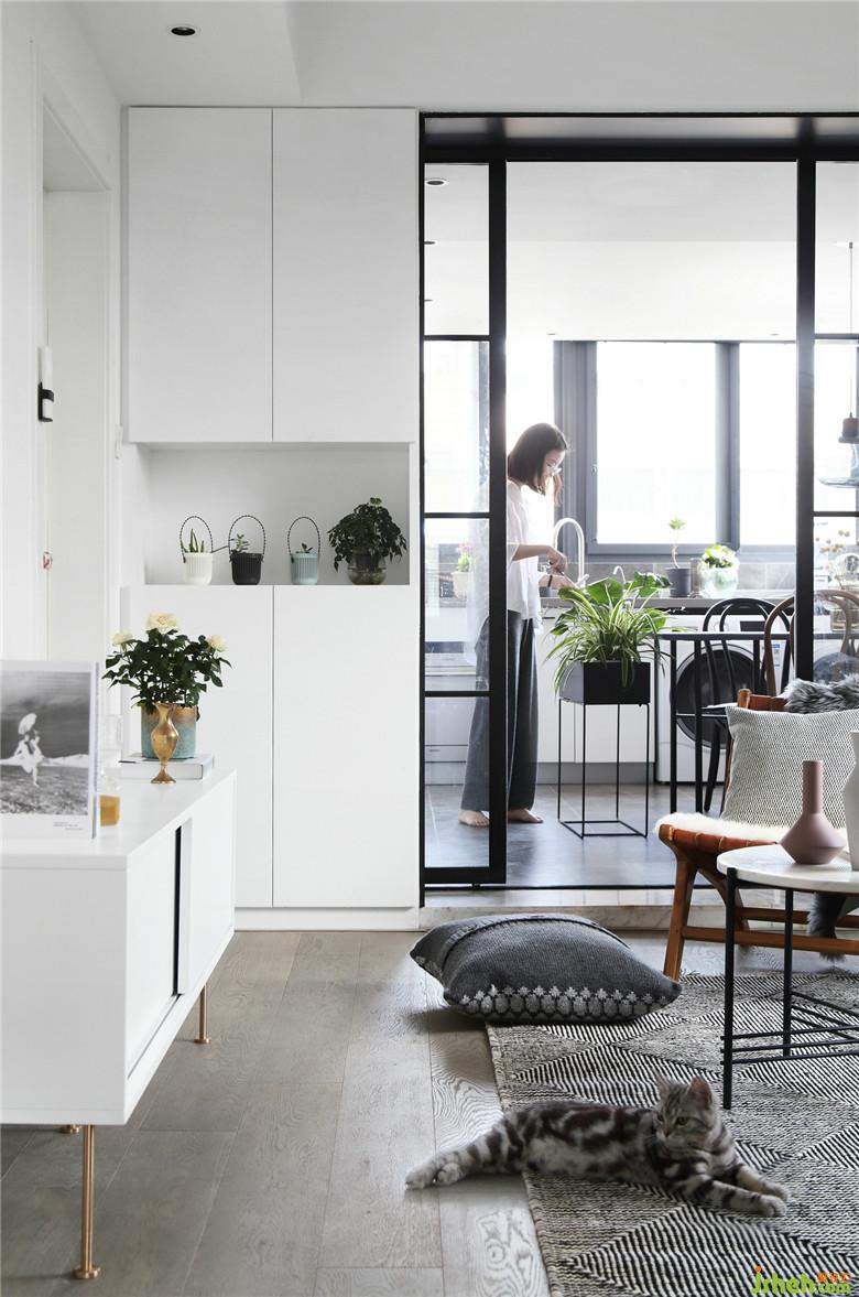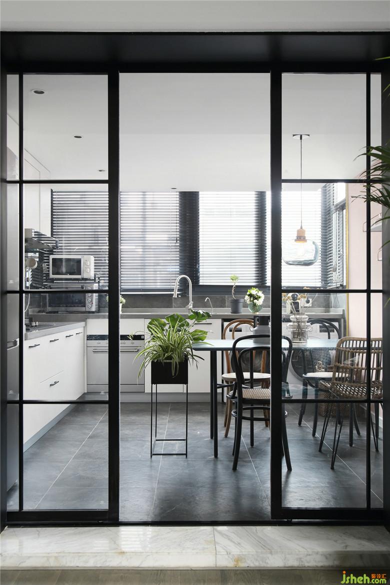 ▲厨房空间以纯净的白色贯穿其中,在这片场域中,不需要过多的颜色,白净的厨房空间营造出通透利落的视觉感受,室内设计师以灰色砖贴墙地,耐脏且有设计美感。入户的纯白鞋柜与移门在一条水平线上,拆除原户型中厨房的窗户,以黑框玻璃移门来扩大视觉空间,加强厨房通透性,在有限的格局下,做出奇妙的能力改造。