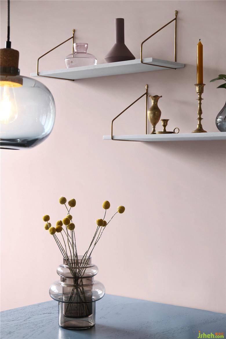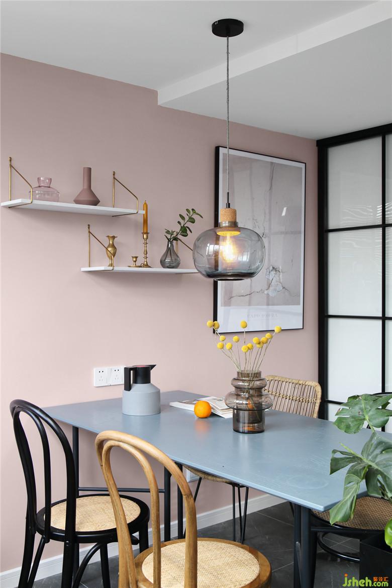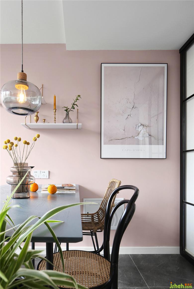 ▲客厅的粉色墙面延续到餐厅,挑选的装饰画也巧妙的用了浅浅的粉。墙上的搁板既不占用空间也成为这块区域的展示处,生活处处需要小惊喜。而藤制餐椅也用了不同的颜色与造型搭配,却又在统一风格里,丰富的纹理与材质,带来优雅与质感的结合——多材质下的平衡设计。