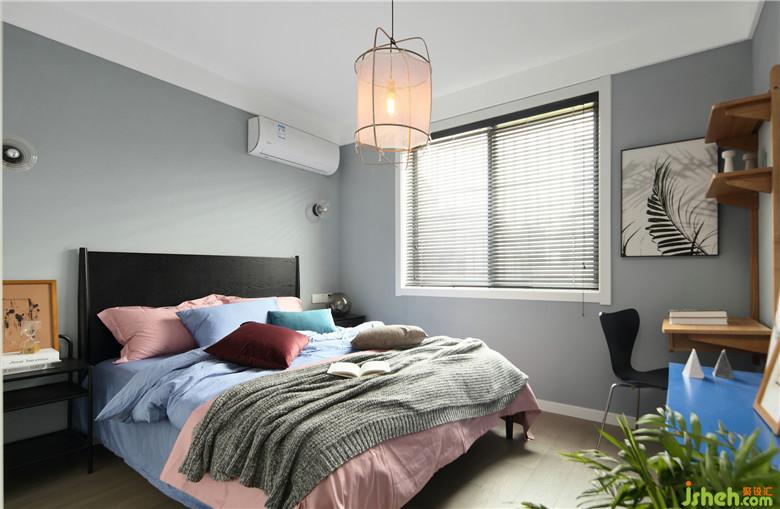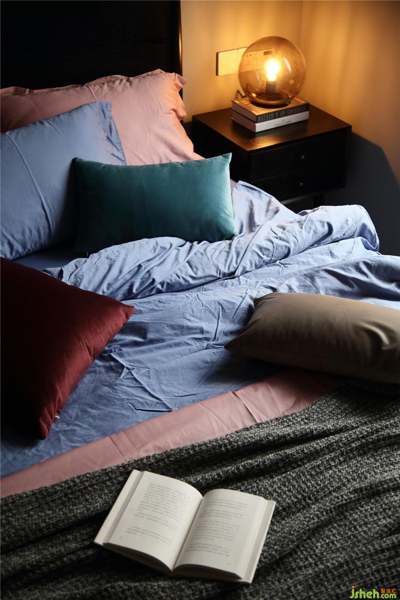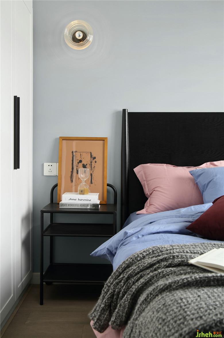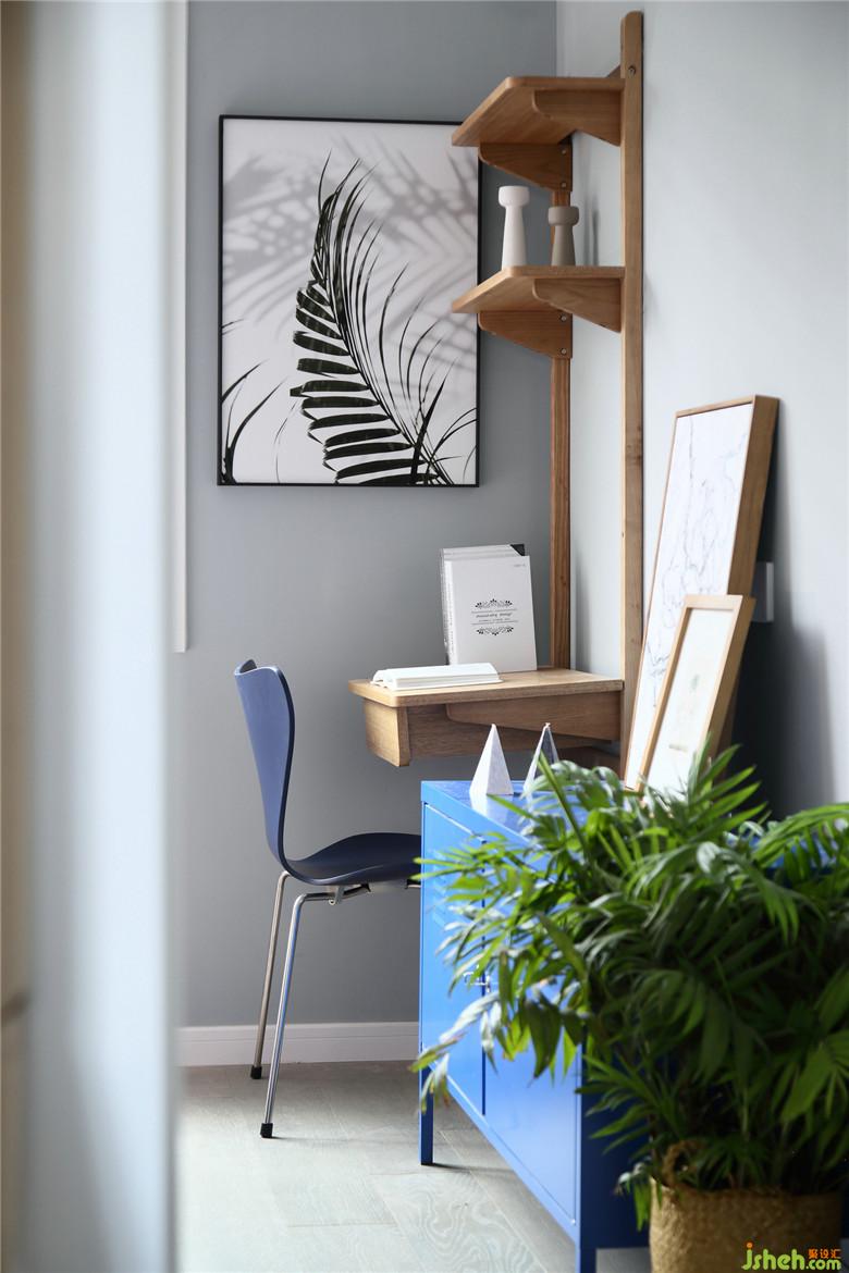 ▲卧室作为睡眠区域,灰色系墙面在视觉上较为舒适且有助于睡眠。卧室一角设置了书桌区域,并不厚重的书桌款式结合了书架功能,也可作为女屋主的化妆区域。