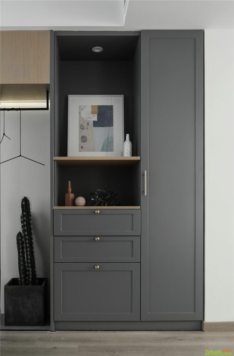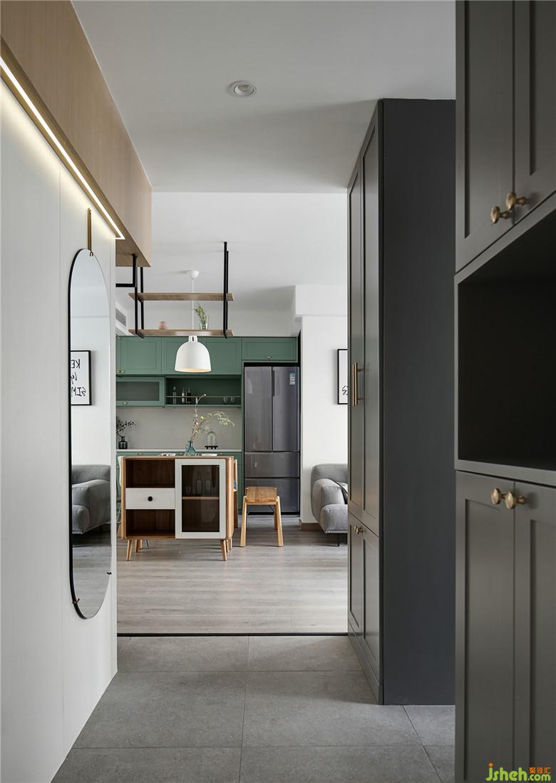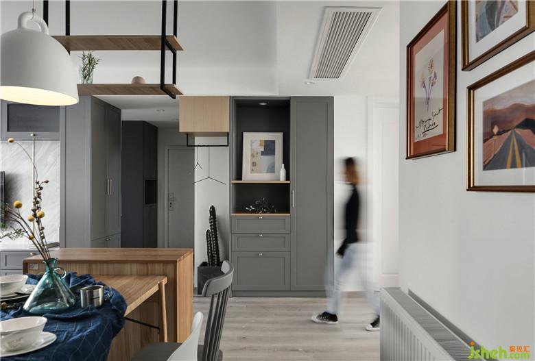▲从餐厅处看向入户玄关,浅灰色的收纳柜与入户鞋帽柜呼应设计,半开放式的布局也是家中进行展示的巧妙位置。原本柜体这块有部分隔墙,造成了从入户看向客餐厅阻挡视线的弊端,而室内设计师将隔墙打掉,同时为了扩大主卫空间,将主卫墙体向外推,最终留出收纳柜的深度。收纳柜顶部的木色块体底部内嵌了灯管,下方设置了一个置衣架,这样不仅使空间通透不阻挡视线,也方便于回家后外套的放置。