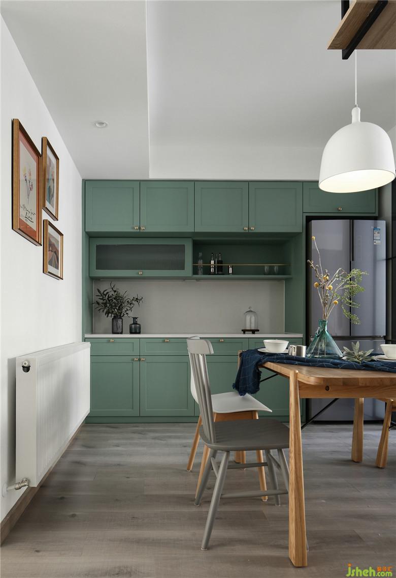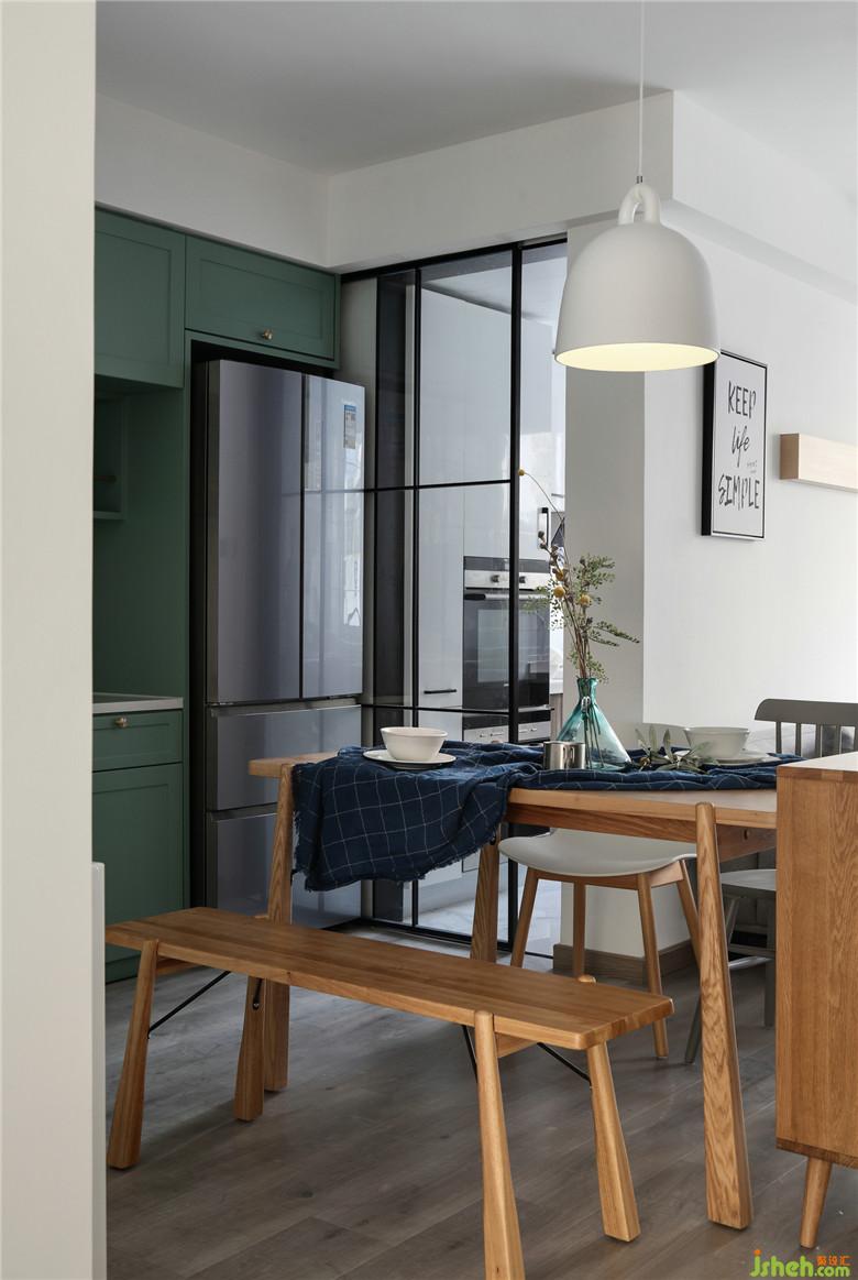 ▲对于餐厅的位置确定是本案设计的关键之处,室内设计师考虑到餐边柜及暖气片的位置摆放,还要避免正对厨房门,如果仅靠厨房一侧摆放,不仅进出不便,也浪费了中间的过道空间。最终将餐厅确定在了这片区域中间的一个位置,行走动线顺畅的同时也充分利用了空间,暖气片及餐边柜也有了合理的规划。