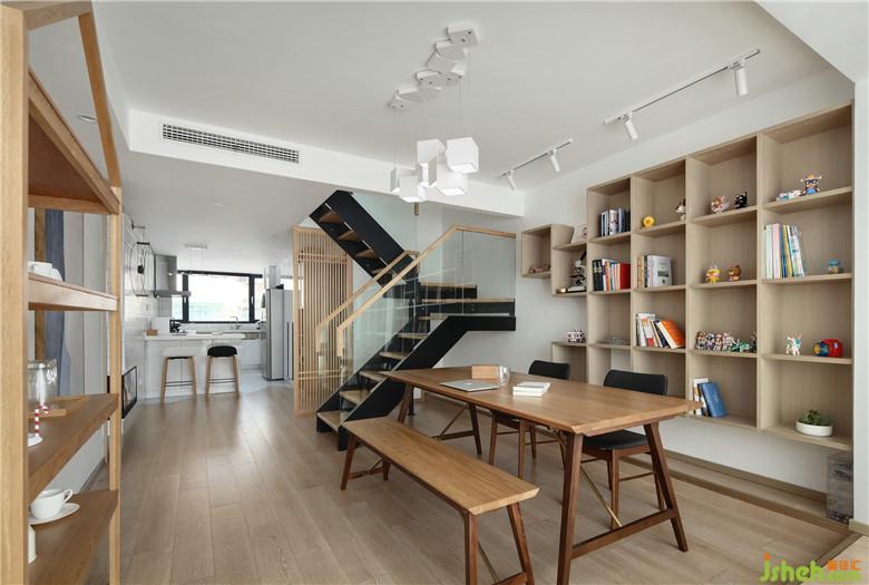 ▲考虑到屋主喜欢现代化、多功能的生活方式,于是室内设计师无论在材质、颜色搭配或是功能区布局上,以灵动、多用途进行规划。因为二层空间已经有了很多休闲区域,一层我们尽量用作孩子的学习娱乐,而且一家人喜欢做手工,这样的一张大桌足够用于家庭的学习娱乐了。