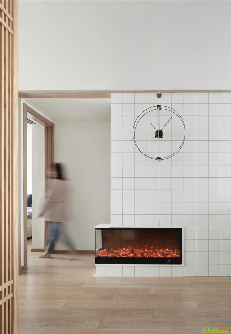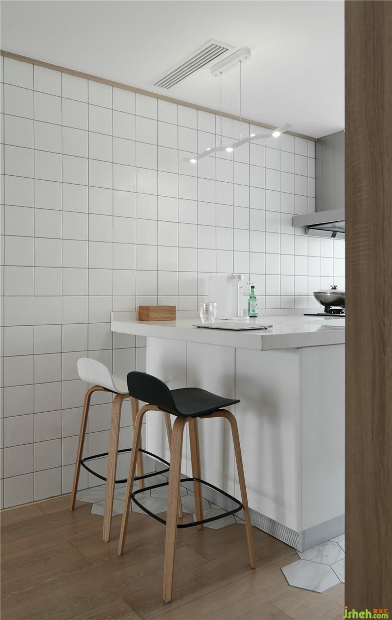 ▲从入户处望去,满墙的小白方砖让整个家都显得清新舒缓,结合嵌入的壁炉设计,仿佛是空间中的画龙点睛一笔,室内设计师搭配极具设计感的极简时钟,瞬间提升了空间的质感,让进入室内的人眼前一亮!厨房空间设置了一个小吧台,不仅可以作为平时简餐时的用餐区,当家人做菜时,也能增加彼此间的交流和亲密感。